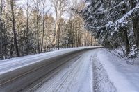 A gloomy day in Ontario, Canada. The grey sky casts a somber tone over the landscape. The asphalt road winds through the forest, lined with snow-covered trees. Nature's gloom at its best.