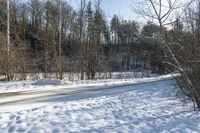 This is a beautiful landscape photo taken in Canada. The image captures a snow-covered forest with a road winding through it. It is a clear day with a clear sky, and the trees and branches are covered in snow. The road surface is covered in snow as well. The photo showcases the stunning natural scenery and the freezing winter conditions in Canada. The vegetation along the road includes trees and twigs. This photo represents a typical winter day in Canada, specifically in the city of Toronto.