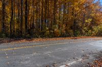 This is an image of a road in Toronto, Ontario, Canada. The road is surrounded by a forest of trees, with yellow leaves covering the ground. Above, the clear sky provides a bright backdrop. In the foreground, a black fire hydrant can be seen sitting on top of the road. This photo represents a typical autumn day in Toronto, with the vibrant colors of the trees and fallen leaves. It showcases the natural beauty of Ontario's forests and the peacefulness of the road.