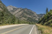 This is an image of a highway in British Columbia, Canada, going downhill into a big wooded landscape in the mountains. The clear sky above provides a beautiful backdrop to the scenic view. The road surface is made of asphalt and is flanked by vegetation and trees on either side. The highway is equipped with guard rails and Armco barriers for safety. This photo captures the natural beauty of the highlands in British Columbia, showcasing the harmony between nature and infrastructure.