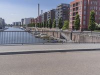 A man in a white jacket walks along a bridge in Frankfurt, Germany. Modern architecture lines the waterfront, with boats dotting the water. Clear skies reveal the city's urban design.