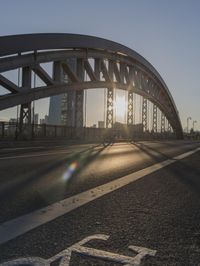 This is an image of a sunny morning in Frankfurt, Germany. The cityscape is dominated by the impressive architecture, including a tied-arch bridge and various urban infrastructure. The clear sky above is filled with sunshine, creating beautiful reflections on the iron and metal structures. The image captures the vibrant city and its modern infrastructure. The sun is visible in the sky, casting shadows and creating a striking contrast. This photo represents the city of Frankfurt in a peaceful and sunny dawn.