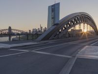 Cityscape of Frankfurt, Germany at dawn. Sunshine casts shadows on the urban landscape. Clear sky with visible sun and contrails in the background. Tied-arch bridge and road provide architectural highlights.