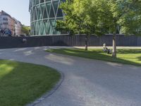 A modern office building in Frankfurt, Germany, situated in the bustling business district. The architecture blends seamlessly with the urban landscape, surrounded by lush lawns, trees, and a vibrant public space. The clear sky and contrails add to the dynamic atmosphere.