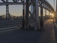 the sun shines behind an overpass with a large bridge in the background, with buildings in the distance
