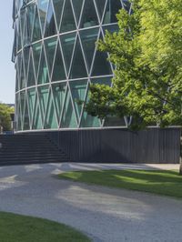 A modern architecture marvel in Frankfurt's business district. The building's geometric structure shines against a clear sky. The park area provides a serene setting with lush green grass and woody plants.
