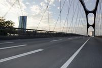 This stunning stock photo captures the urban beauty of Frankfurt, Germany at dawn. The image showcases the city's impressive architecture, including a magnificent tied-arch bridge. The road, lined with motion blurred automobiles, leads into the metropolitan area. The cloudy sky adds a dramatic touch to the scene. This photo is perfect for illustrating infrastructure, city life, or transportation concepts.