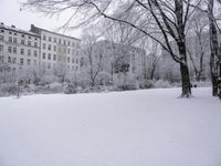 A freezing landscape with a building in the background surrounded by trees. The window on the building adds a touch of style to the scene. The branches and twigs of the trees are covered in vegetation.