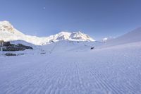 A stunning view of the snow-covered mountains in the French Alps. This picturesque landscape is a popular tourist attraction in Europe during the winter season. Clear skies and contrails add to the beauty of the scene.
