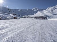 A snowy mountain road in the French Alps, with a bus patiently waiting. The clear sky and sunshine add to the beautiful landscape. This tourist attraction offers skiing and stunning views of the mountain range.