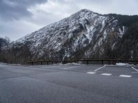 A gloomy winter day in the French Alps. The landscape is covered in snow, with a grey sky overhead. A road leads to a parking lot in a rural valley surrounded by mountains. Open spaces and wet terrain add to the beauty of nature in foul weather.