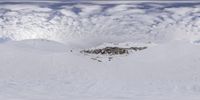 a man is snowboarding on the snowy mountain side and looks down at the camera