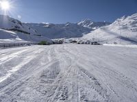 A picturesque view of snow-covered mountains in the French Alps. The clear sky and open space make it an ideal tourist attraction. The ski slopes and parking lot provide easy access to this beautiful winter landscape in Europe.
