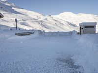 A winter landscape in the French Alps. A snow-covered mountainside offers a breathtaking view, with a small store visible below. Clear skies and freezing temperatures make it an ideal tourist attraction for skiing and snowboarding in Europe.