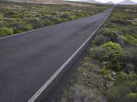 A scenic view of an endless road in Fuerteventura, Spain. The lush green landscape and highland terrain create a picturesque backdrop. The road surface, lined with trees, stretches into the distance under a clear blue sky.