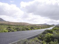 A scenic road in Fuerteventura, Spain. The asphalt winds through the desert landscape, surrounded by majestic mountains and lush vegetation. Clouds dot the clear blue sky, creating a picturesque and tranquil scene.