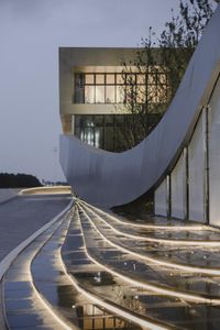 A futuristic architecture building in Hefei, China. The modern design features a large circular structure on top of the stairway. The building is illuminated by artificial light, creating a stunning display at night.