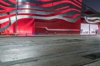 An image showcasing a futuristic architecture in a city at night. The cityscape is illuminated by artificial lights, with street lights and office buildings creating a stunning urban landscape. The road, made of asphalt, leads to a futuristic and elegant driveway, creating a sense of entry into a business district. The dark sky contrasts with the bright lights, adding an intriguing atmosphere to the scene. In the foreground, a museum stands out creating an artistic touch to the overall composition.