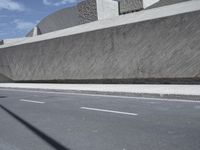 This image showcases modern architecture in the city of Tenerife, Spain. The concrete and asphalt road surface leads towards a futuristic building with a minimalist facade. The clear sky and cloud create a striking backdrop for the Brutalist architecture. The materials used in the construction, such as cement and line, highlight the unique design of the building. This picture captures the blend of modernity and European charm in Tenerife.
