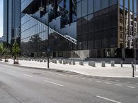 This is an image of a modern architecture building in Berlin, Germany. The cityscape showcases the urban design and the futuristic architecture. The high-rise building with its unique facade stands out among the other office buildings in the financial district. The road surface made of asphalt is lined with trees, while the public space features a zebra crossing. The image captures the essence of city life in Berlin, Europe's bustling business hub. The structural elements of the building create interesting tints and shades. This is a representation of the architectural visualization (archviz) of Berlin's thriving urban environment.