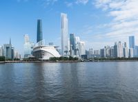 A stunning view of Guangzhou, China's futuristic cityscape. The city's modern architecture stands tall along the coastal skyline, with the river and open spaces adding to its charm. A clear sky above reflects in the harbor's water, creating a picturesque scene.