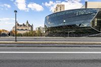 This stock photo features a stunning view of a futuristic architecture in Ottawa, the capital city of Canada. The photograph showcases a modern office building with a glass façade and a glass wall. The building is located in a bustling business district, surrounded by well-maintained roads and street lights. The clear sky and cloud formations add to the beauty of the cityscape. The road surface, made of smooth asphalt and tar, is complemented by the neatly designed curbs. The image captures the essence of urban design and portrays the vibrant city life in Ottawa.