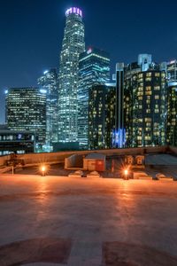The cityscape of Los Angeles at night, with futuristic office buildings and modern architecture illuminated against a clear sky. The urban design features concrete surfaces and artificial light, creating a vibrant and dynamic city life.