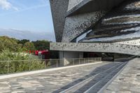 A futuristic architectural masterpiece in Paris, France. The unique building stands out against the clear sky and overlooks the water. Its modern design blends seamlessly with the surrounding urban landscape.