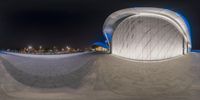 A skate park at night filled with skateboarders performing tricks. The modern and futuristic architecture of the park creates a striking backdrop. The city's artificial lights illuminate the scene, adding to the urban atmosphere.