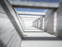 This image showcases the modern architecture of a building in Tenerife, Spain. The concrete structure features clean lines and white surfaces that reflect the natural light. The large windows and clear sky create a sense of openness and brightness. Inside the building, a staircase leads to different floors, while the motion blur effect adds a dynamic element to the composition. The futuristic design is complemented by the tunnel-like room with a distinct ceiling. This photo represents the contemporary architectural style of Europe, specifically the unique designs found in Tenerife, Spain.
