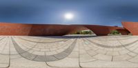 A mesmerizing fish eye view of a modern architectural structure, with sun flares adding artistic flair. The clear sky creates a calm atmosphere, while the building's design stands out in the urban landscape.