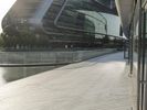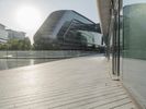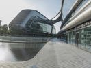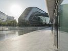 A futuristic office building in Shanghai's urban park. The angled fish-eye view captures the innovative architecture, with glass facades reflecting the clear sky. Walkways and trees create a tranquil courtyard in the bustling metropolitan area.