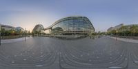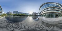 the 360 - angle fish - eye view of a building in a park, including stairs, trees and walkways