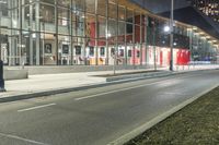 A nighttime view of a futuristic glass building in the heart of Toronto's metropolitan area. The empty street and city lights create an eerie and captivating atmosphere. A modern take on urban design.