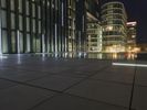 A futuristic cityscape of Duesseldorf, Germany at night. The city's architecture reflects in the center bowl, creating a symmetrical and reflective atmosphere. The clear sky and artificial light enhance the metropolitan area's ambiance.