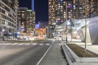 A futuristic cityscape in Toronto, Canada. Modern architecture and high-rise buildings illuminate the night with artificial light. An empty urban street leads to a prominent clock tower in this captivating urban design.