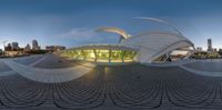 A futuristic concrete bridge in Milwaukee, Wisconsin, stands as a centerpiece of modern architecture. The fish-eye lens effect adds a unique perspective to the straight road, low guard rails, and clear sky.