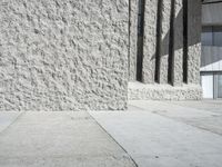 A modern architecture building in Tenerife, Europe. The concrete wall and white surface create a futuristic and monochrome look. The stone and cement sidewalk leads to a green fire hydrant. Two people walk along the sidewalk under a clear sky.