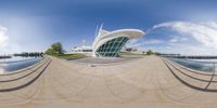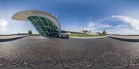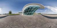 A futuristic high-rise building in downtown Milwaukee, Wisconsin. Its unique curved design and glass walls create a striking contrast against the clear sky. The building stands as an architectural marvel in the bustling metropolitan area.