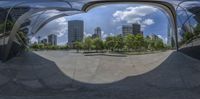 a very long curved building is shown through the lens of it's reflection on the ground