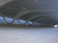 a person riding a skateboard down a sidewalk under a large structure of vaulted ceilings