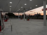 A gas station illuminated by artificial light, with three pumps on the concrete surface. The empty bins next to the pumps create a contrasting image against the night sky.
