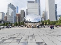 In the bustling metropolitan area of downtown Chicago, a crowd is gathering in a big public plaza. This vibrant cityscape is filled with modern architecture, high-rise buildings with mirrored windows, and a stunning skyline. The open space is surrounded by city buildings that reflect the grey sky, creating a captivating atmosphere. The plaza features a sculpture, trees, and a surface covered in lush green grass. This urban oasis is a popular tourist destination, offering a unique blend of art, architecture, and natural elements in the heart of the windy city, Illinois, USA.