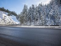A stunning winter landscape in the Alps of Germany. Snow-capped mountains tower over a winding road, with trees lining the wet and icy asphalt. The Armco barriers provide infrastructure and safety amidst freezing conditions.