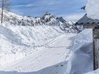 a person is skiing on a snowy hill side trail next to a lodge in winter