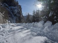 A picturesque winter landscape in the German Alps. The snow-covered road winds through the mountain range, with clear skies and the sun visible. Fir trees and stone walls add character to the scene.