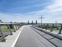 A modern architecture bridge in Germany, surrounded by lush vegetation and clear skies. The road surface is made of smooth asphalt, harmonizing with the urban design. Power poles line the thoroughfare, showcasing the country's efficient infrastructure.