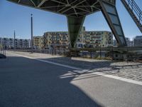 A modern architecture cityscape in Germany, with a clear sky and hard shadows cast by the buildings. The coastal city features a pier and cobblestone roads. Warehouses and storage facilities line the urban landscape.