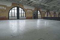 A classic warehouse in Berlin, Germany, with beautiful brickwork and cement flooring. The open space is filled with natural light from the numerous windows, highlighting the white wood floors. A perfect example of European architecture.