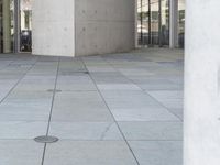 A person on a skateboard stands in front of a modern office building in Berlin, Germany. The glass doors and concrete facade create a sleek and urban look. The open space and grey surroundings add to the architectural appeal.